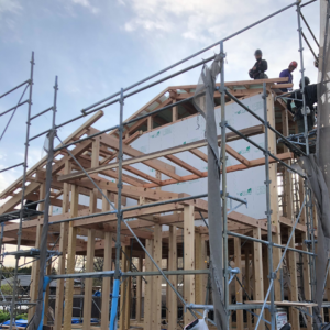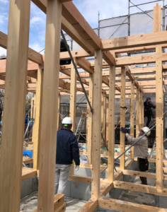 朝早くから建て方が始まり、前日の雨が残らないか少し心配もありましたが、大工一丸となって無事組み上げることができました。
