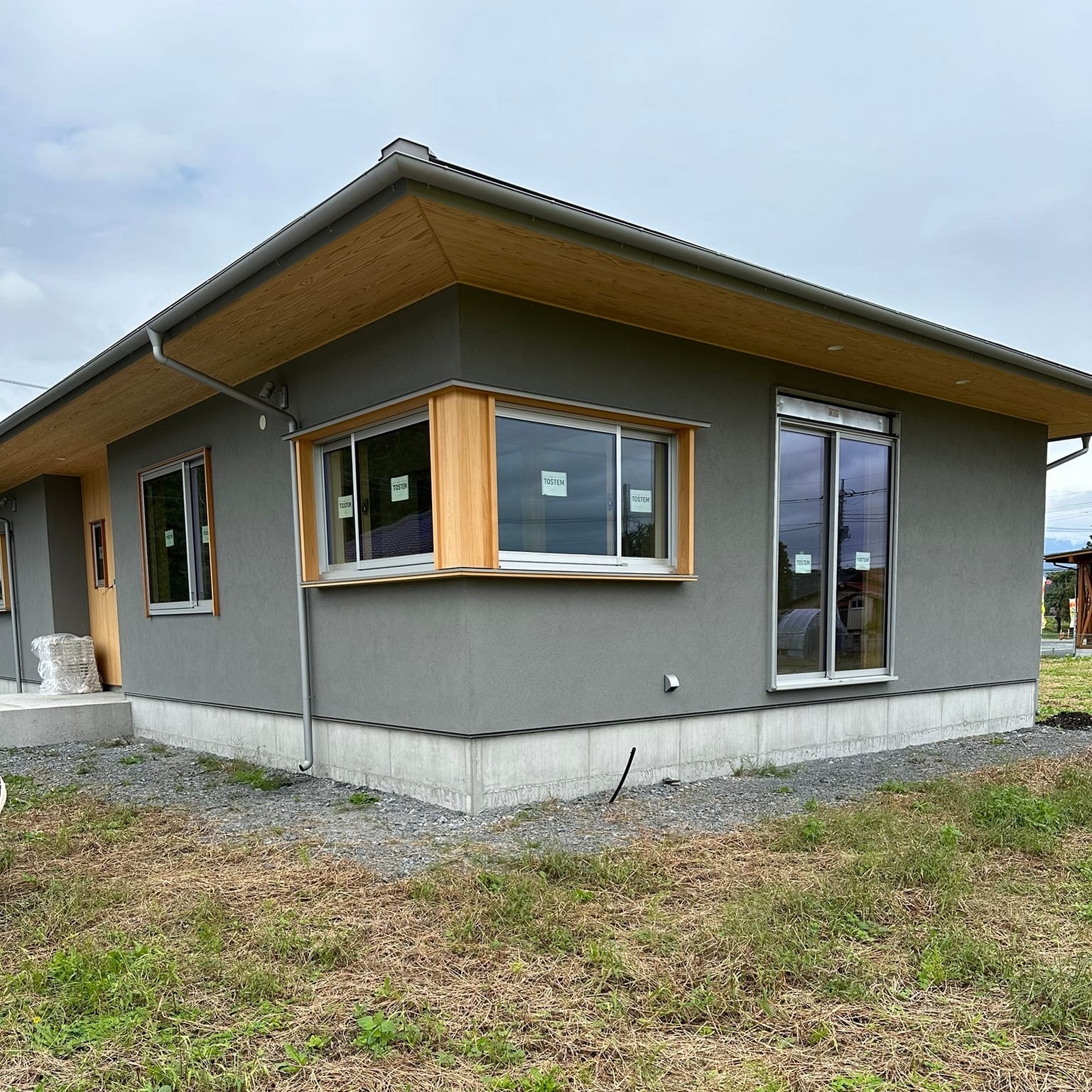 グレーの落ち着いた外壁に窓の木部がアクセントとなり、長閑な風景の中に存在感のある佇まいとなっています。