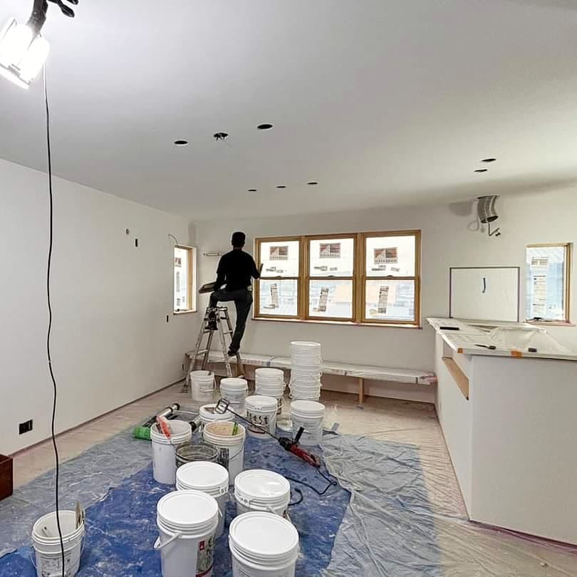 大工工事が完了し、左官屋さんが塗り壁施工中です。