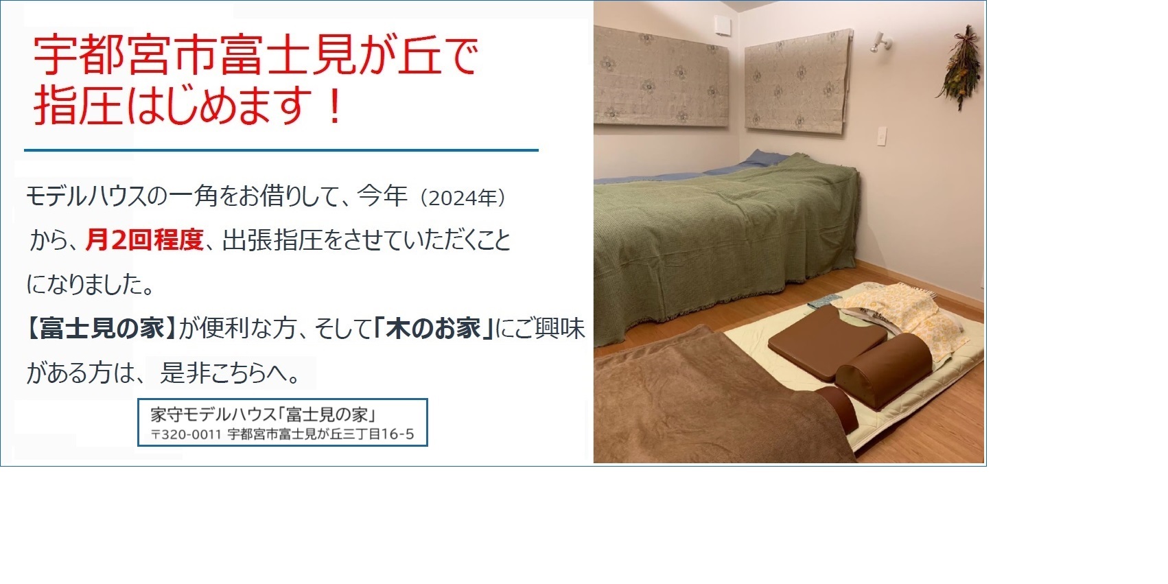 モデルハウス「富士見の家」にて指圧家のがちゃんの出張指圧が始まります!