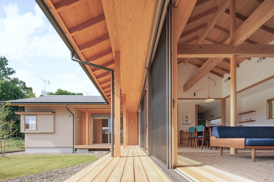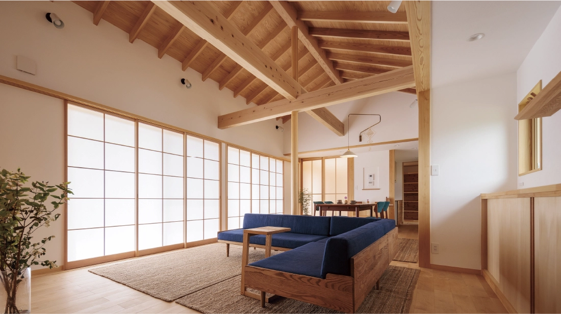 「木をふんだんに使った家にしたかった」というU様ご夫妻。東西に長い敷地に配されたU様邸は、ゆとりこそあれど決して無駄のない端正な平家の住まいです。リビングに設けられた大きな開口部から望むのは、島のように有機的に植えられた芝生の庭。リビング・デッキ・庭・その向こうの畑と連続した空間としてつながることでゆったりとした奥行きを感じさせ、障子を閉めれば秩序ある空間へと変化させることができます。