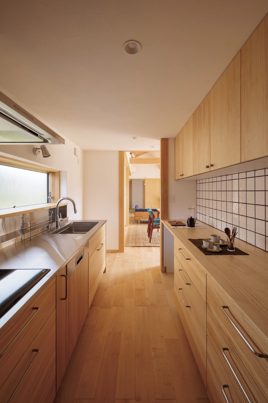 ご家族は3歳の双子の男の子と1歳の女の子のいるにぎやかな5人家族。それぞれに忙しい仕事を持つご夫妻のこだわりは、家事のしやすさでした。建築家・中村好文氏の手がけたキッチンを参考に、計画当初から具体的なイメージを描かれていたキッチンは、化粧垂木ののびやかな勾配天井の雰囲気とは正反対の小屋的空間のクローズドキッチン。続き間となっているため、目配りをしながらも集中して料理に取り組むことができます。