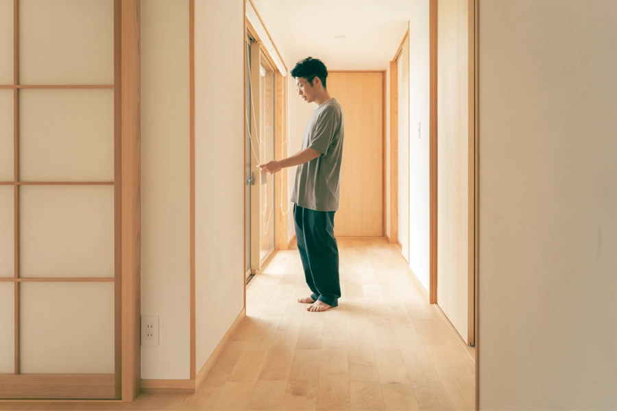 L字型になる西側にある寝室と子供部屋の一角は、明るい雰囲気のカバザクラの廊下。古い日本家屋にあるような廻り廊下となっていて、お子様たちの遊び場になっています。ファミリークローゼットや浴室を結び、回遊性のあるつくりに。